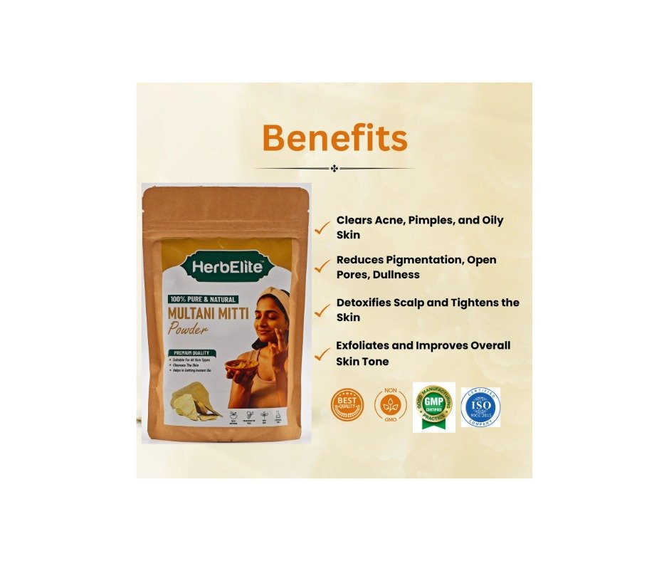 - Pure and natural Multani Mitti (Fuller’s Earth) for deep skin cleansing, oil control, and glowing skin.